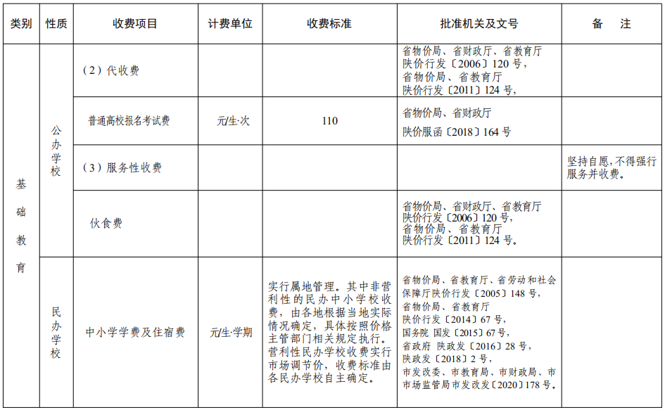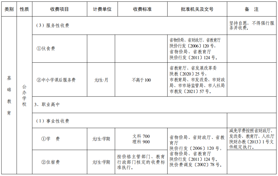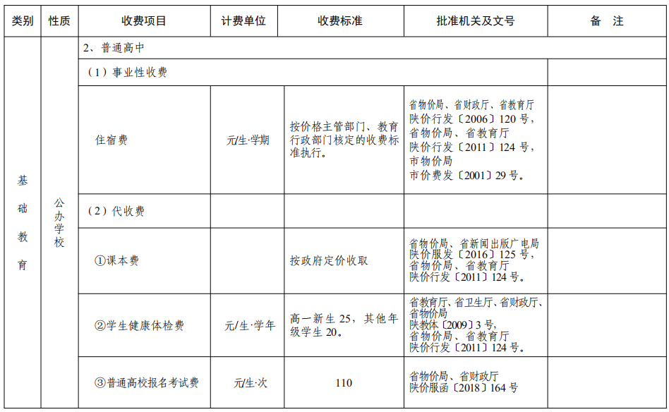 西安市2022年秋季中小学校及普通高校收费一览表