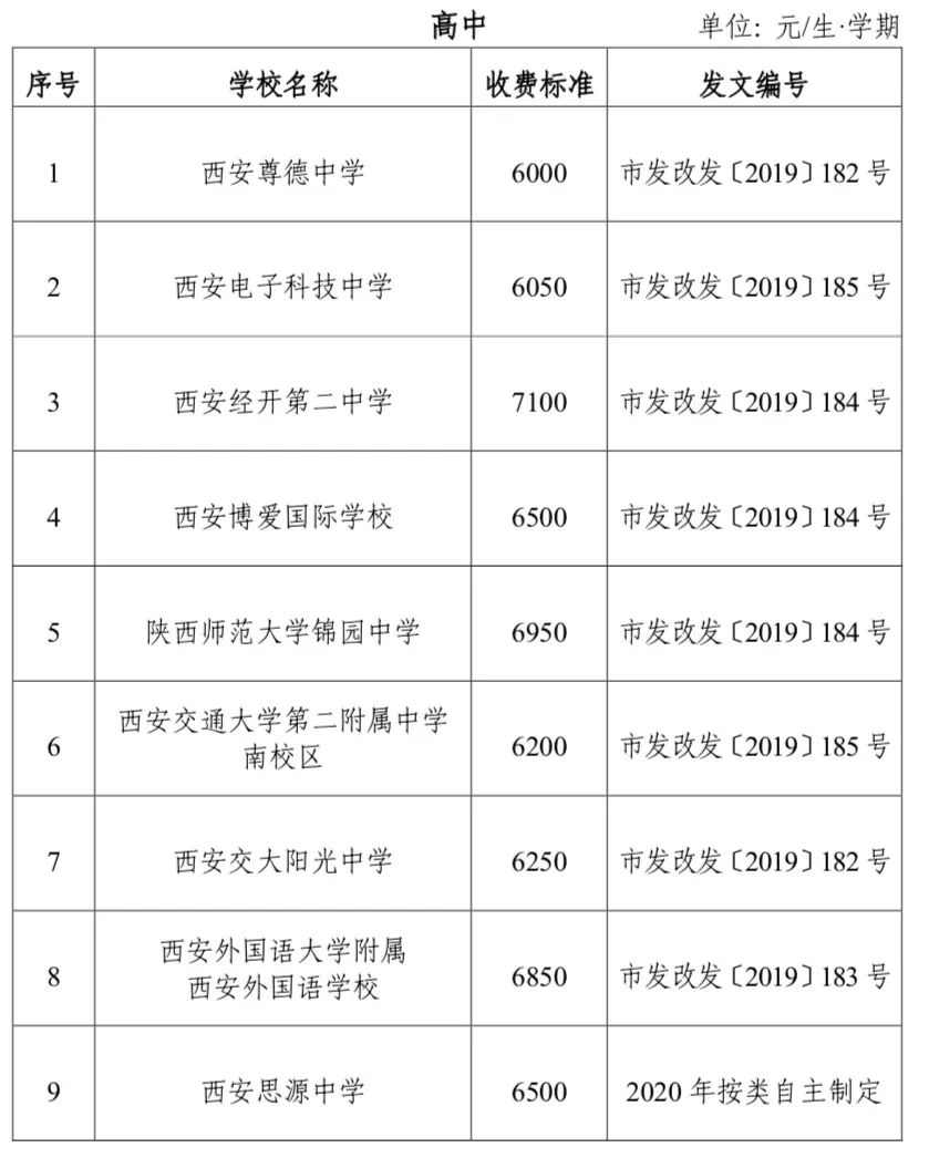 西安民办高中学校收费分类标准