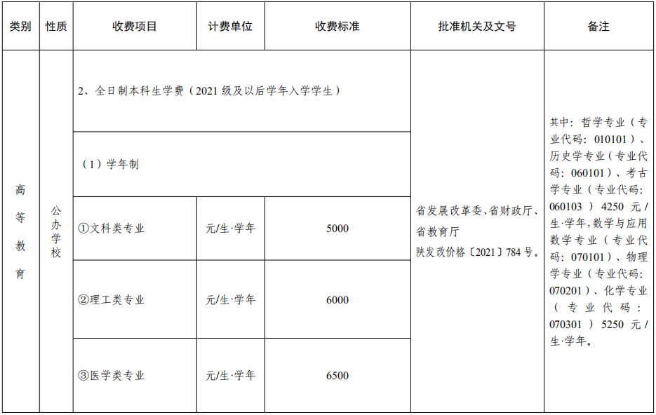 (一)普通本科学费标准。文科类5000元/生·学年,理工类6000元/生·学年,医学类6500元/生·学年,艺术理论类11000元/生·学年、实践类14000元/生·学年。其中:哲学专业(专业代码:010101)、历史学专业(专业代码:060101)、考古学专业(专业代码:060103)4250元/生·学年,数学与应用数学专业(专业代码:070101)、物理学专业(专业代码:070201)、化学专业(专业代码:070301)5250元/生·学年。